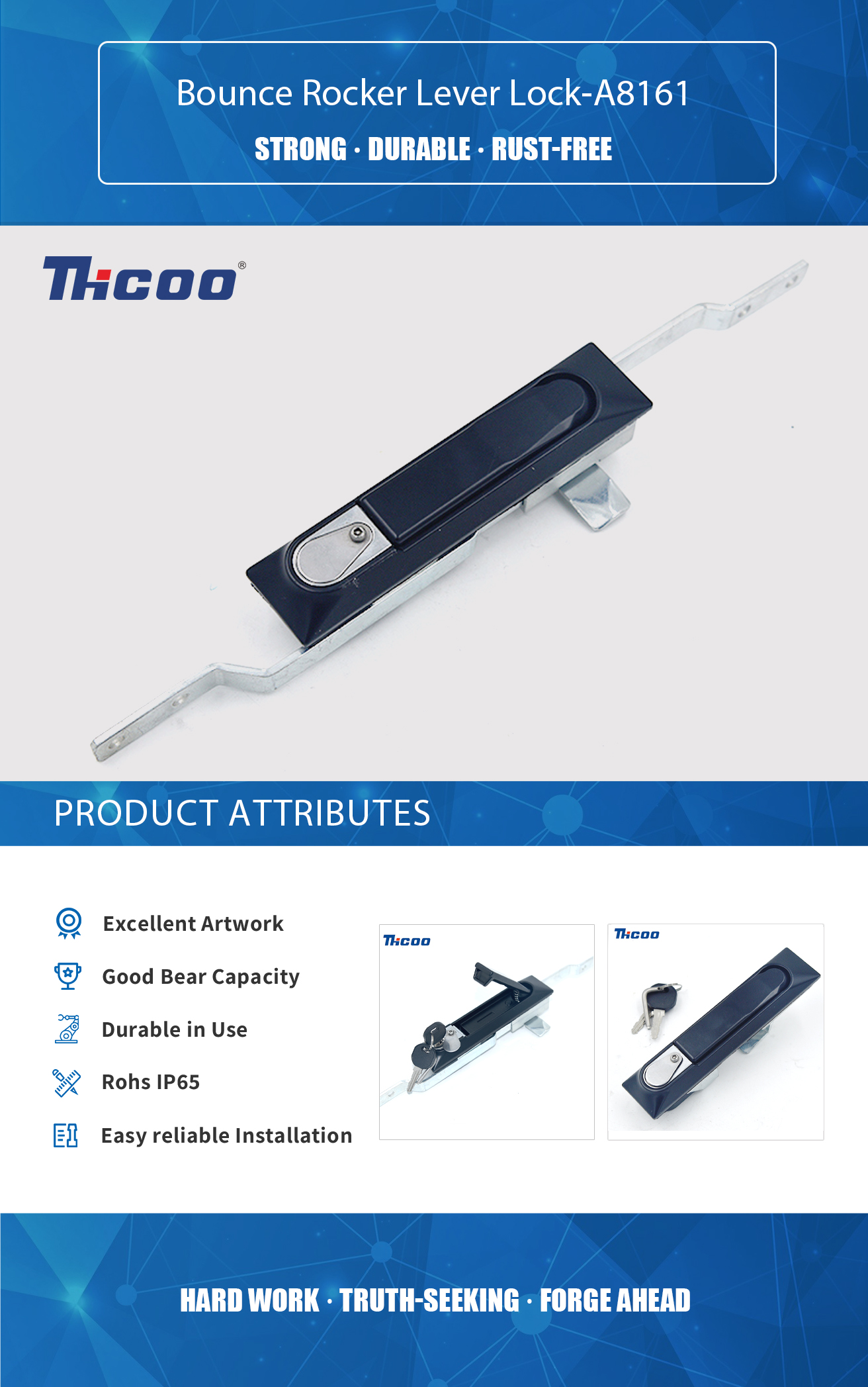 Tenemos nuestro propio laboratorio de pruebas y el equipo de inspección avanzado y completo, que puede garantizar la calidad de los productos. Bounce Rocker Lever Lock-A8161 es un tipo de cerradura que utiliza un mecanismo de palanca basculante y un pestillo con resorte para asegurar una puerta u otro dispositivo. La palanca basculante se mueve con una llave u otra herramienta para desbloquear el mecanismo y permitir que se abra la puerta. El pestillo accionado por resorte rebota en su lugar cuando se cierra la puerta, lo que ayuda a mantener la puerta bien cerrada.