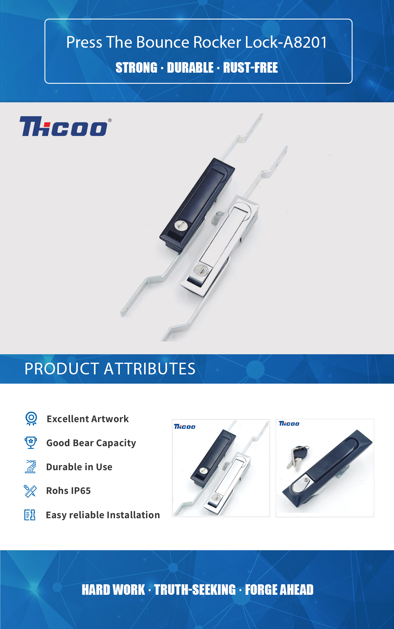 Tenemos nuestro propio laboratorio de pruebas y el equipo de inspección avanzado y completo, que puede garantizar la calidad de los productos. Presione The Bounce Rocker Lock-A8201 son fáciles de usar, con un mecanismo de presión simple que requiere un esfuerzo mínimo para abrir. Por lo general, son compactos y livianos, lo que los hace fáciles de transportar e instalar. Pueden ser adecuados para su uso en una variedad de aplicaciones, incluidos entornos residenciales, comerciales e industriales.